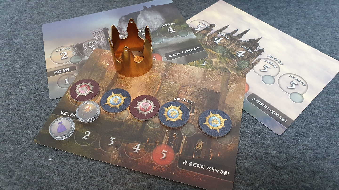 모든 플레이어는 찬성/반대 한 쌍투표 토큰을 받습니다. 무작위로 대표자를 선택하고 대표자는 대표자 토큰을 받습니다. 아래의 표를 참조해서 인원에 따라 선의 세력과 악의 세력에 속한 플레이어의 수가 정해집니다.