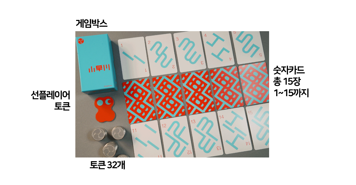 15장의 숫자카드를 잘 섞은 후 모든 플레이어들에게 1장씩 나눠줍니다. 남은 카드는 토큰과 마찬가지로 테이블 중앙에
