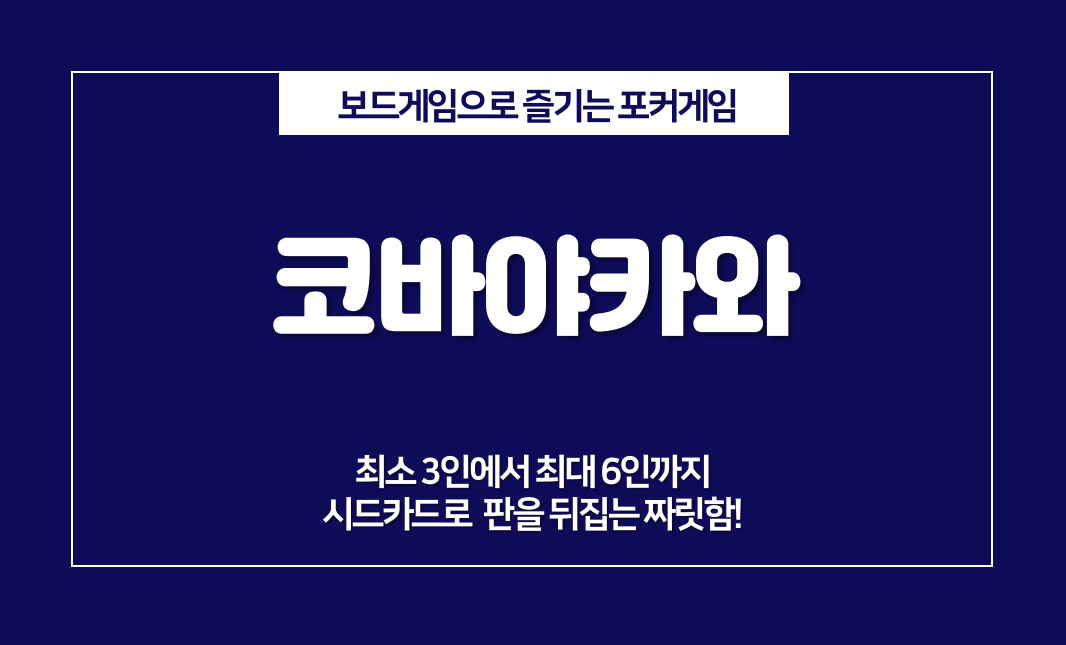 코바야카와 보드게임은 배팅과 블러핑 요소가 있는 보드게임 입니다. 최소 3명에서 최대 6명까지 함께할 수 있습니다. 더지니어스 프로그램에 메인매치로 나왔던 시드포커의 원조 게임입니다.