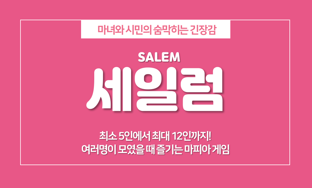 마녀와 마을사람들이 대결하는 보드게임 세일럼 입니다. 최소 5명부터 최대 12명까지 할 수 있는 마피아게임입니다. 마을 사람들은 마녀사냥을 통해 마녀의 정체카드를 공개해야 하고 마녀는 모든 마을 사람들의 정체카드를 공개해서 죽여야 합니다.