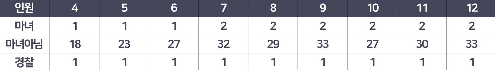 3. 4~6인 게임에서 2명의 마녀를 넣고 하고, 7~12인 게임에서 3명의 마녀를 넣어서 진행합니다.