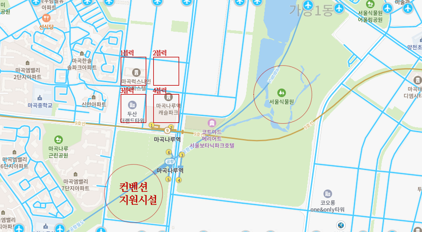 마곡의 중심이 될 마곡나루역. 마곡나루는 오피스형, 업무지구형 상권입니다. 마곡나루역 상권은 크게 4블럭으로 구성되어 있습니다. 바로 건너편에는 중앙과장과 컨벤션 지원시설이 있고 서울 식물원으로 갈 수 있는 지역이기도 합니다.