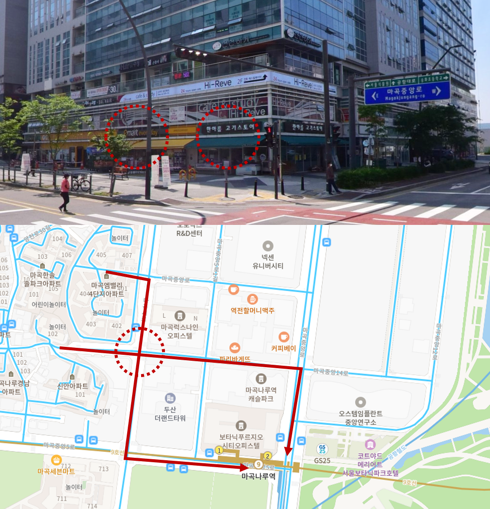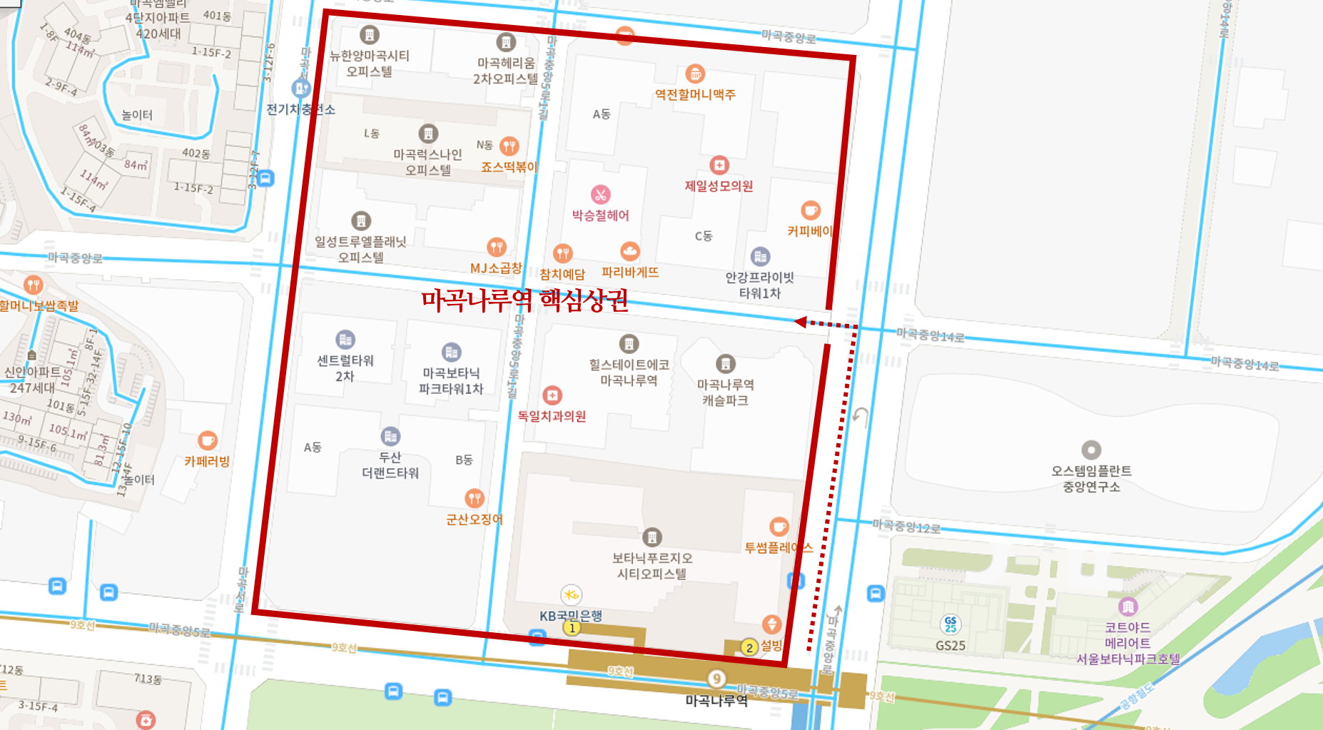 주변에 회사들이 많이 입주를 하지 않아 분위기가 조용했었는데 최근에 많은 업체들이 입주 하기 시작하면서 분위기가 괜찮은 상황입니다. 마곡나루역에서 가장 가까이 있으면서도 아직 공실이 보이는 이유는 아직까지 주변 동선이 이쪽으로 잡히지 않기 때문입니다. 사람들이 주로 다니는 길이 아니라 아직 공실이 있거나 매출이 부진한 상태입니다. 여기서 중요한 것이 바로 주동선! 상권을 볼 때 사람들의 동선이 어떻게 되는지 파악하는 것이 매우 중요합니다.