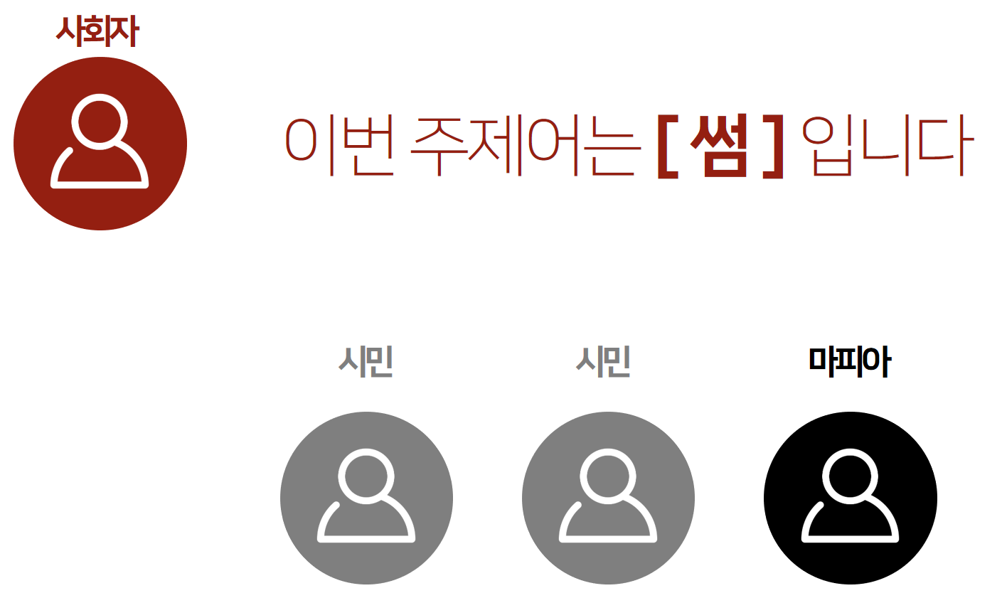 마피아만 알고 있는 단어로 마피아가 수다중에 반드시 이야기해야 하는 단어 입니다.