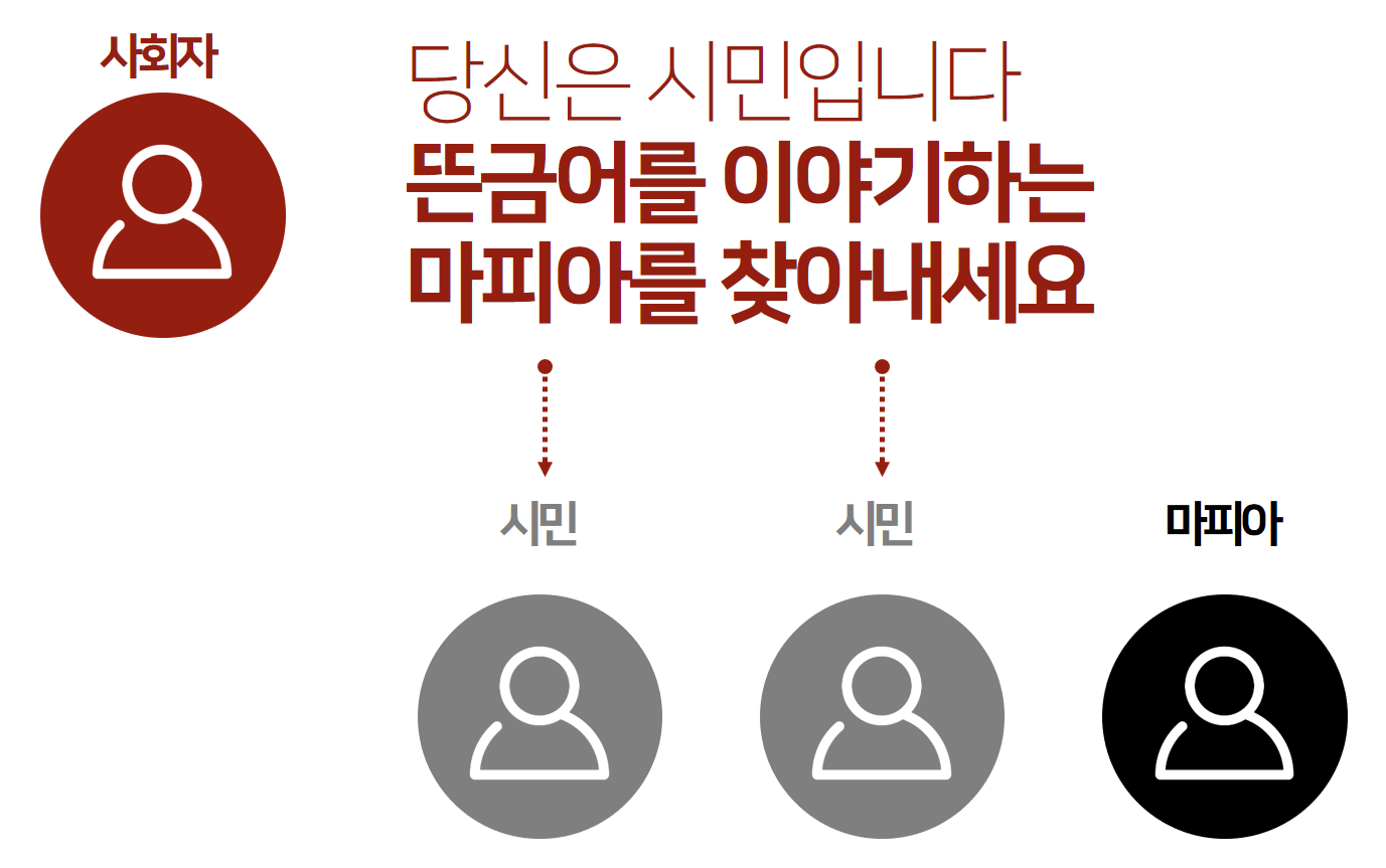 사회자가 주제어와 뜬금어를 선정하고 한명의 마피아를 결정했다면 본격적으로 게임을 진행합니다.