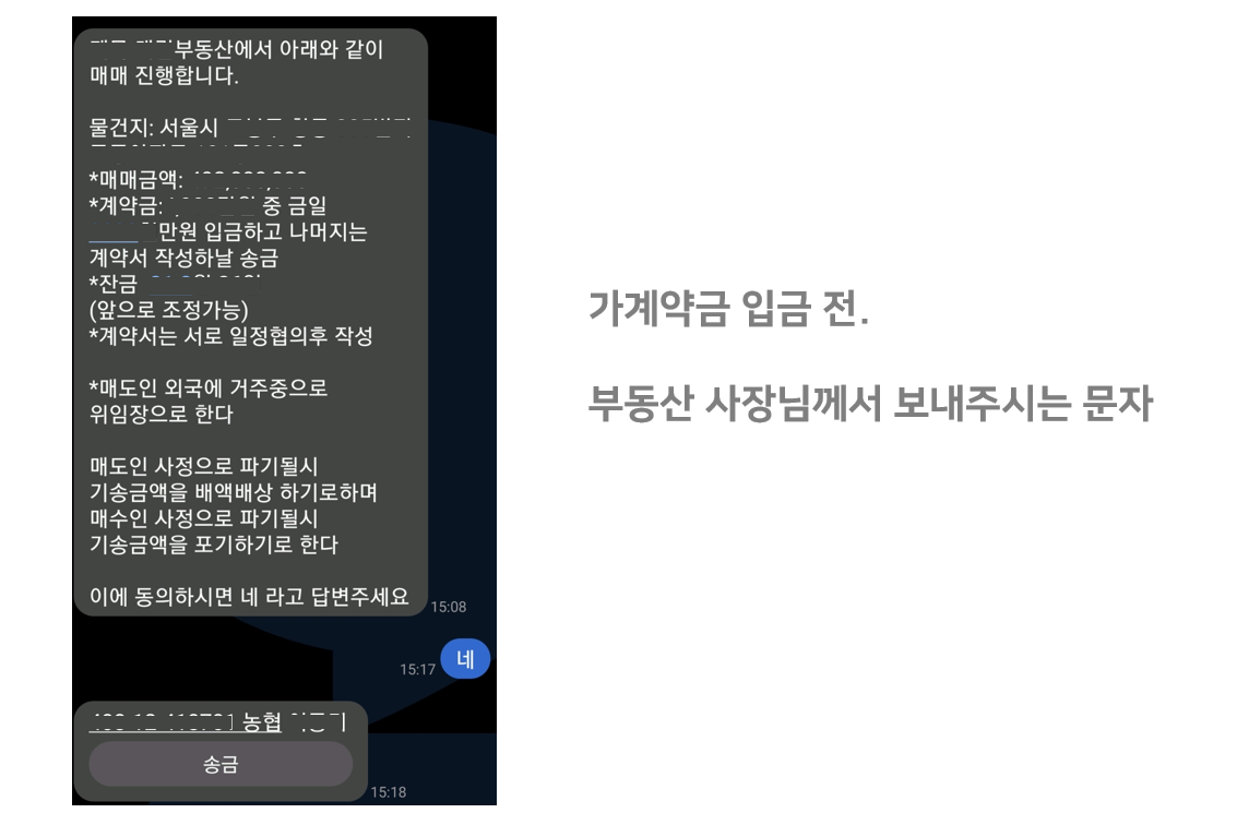 가계약을 진행할 때 부동산 사장님께서 문자를 보내주시는 경우가 있습니다. 문자 내용에 계약금, 중도금, 잔금에 대한 구체적인 금액과 날짜, 매도인의 계좌번호까지 적힌 상태로 문자를 주고 받았다면 계약서를 쓰지 않았어도 가계약이 아닌 본계약으로 볼 수 있습니다.