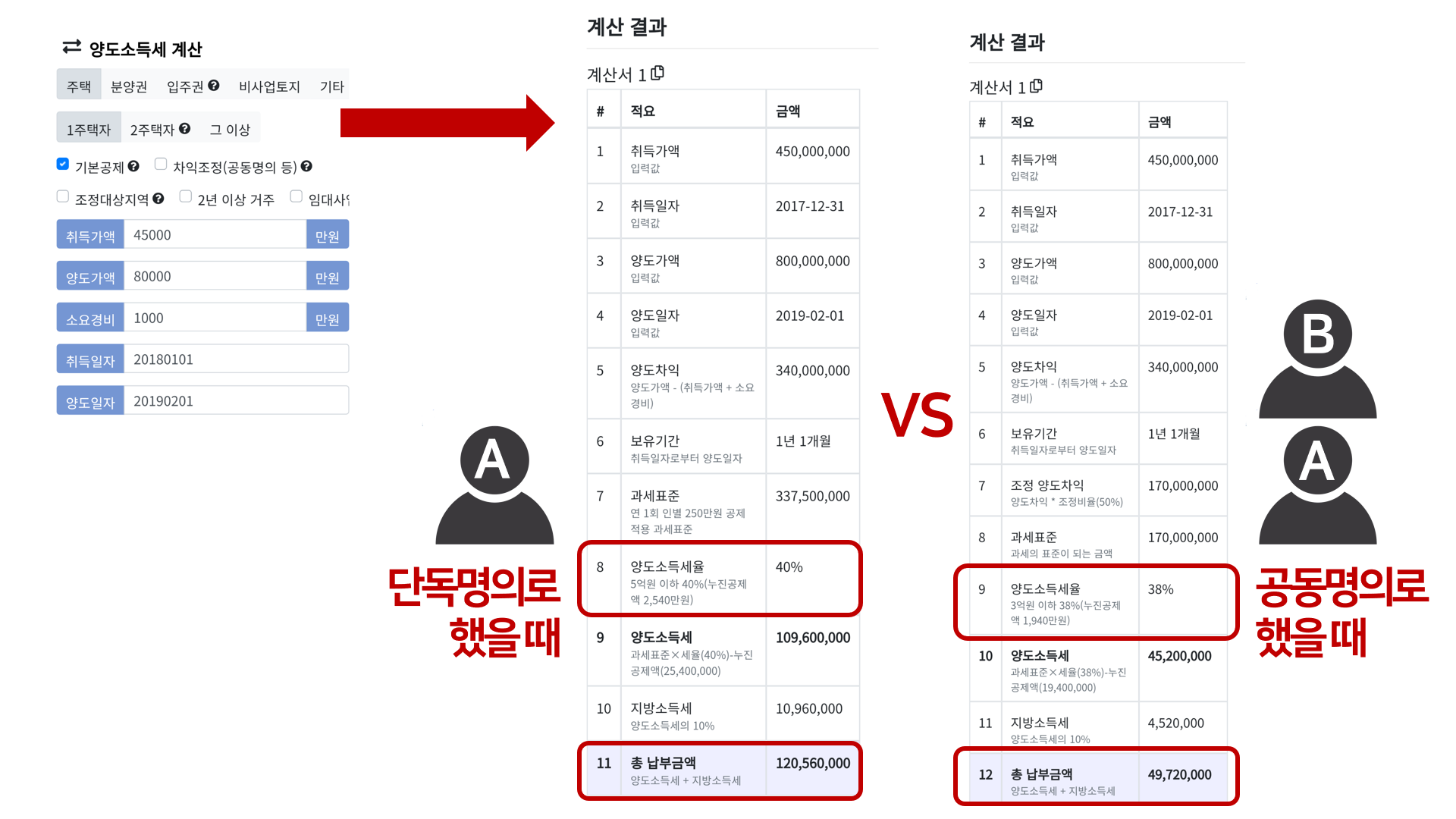 단독명의로 했을 때 납부금액은 120,560,000원. 공동명의로 했을 때 개인이 내는 금액은 49,720,000원 x2를 하면 99,440,000원이 됩니다. 공동명의와 개인명의로 했을 때의 차이가 21,120,000원 입니다. 그래서 공동명의는 안할 이유가 없습니다.