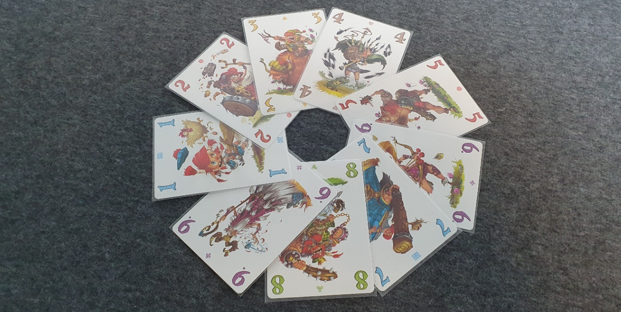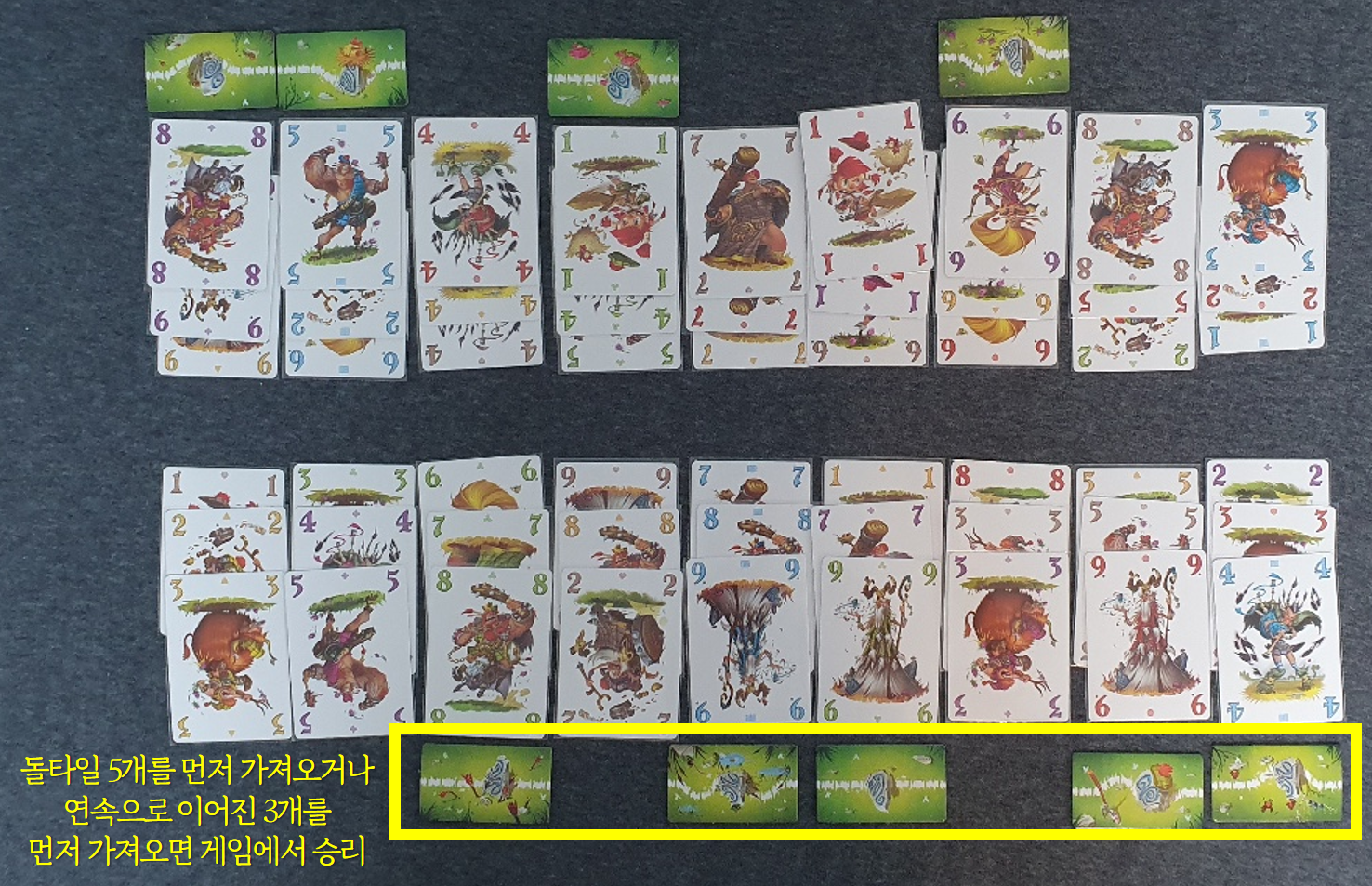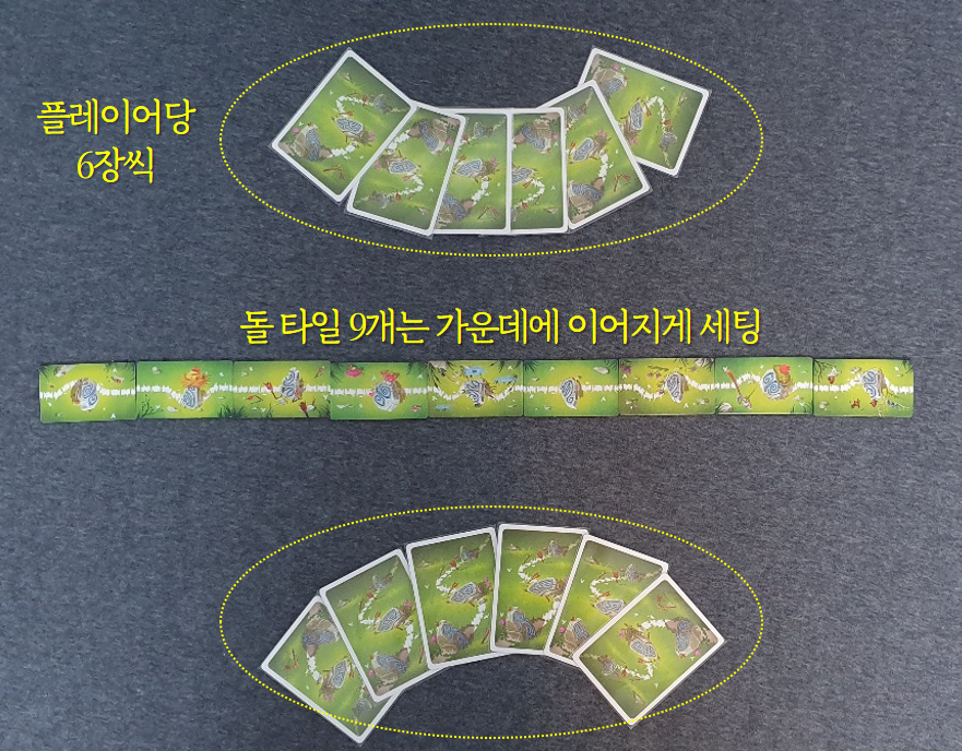카드를 잘 섞은 후 6장씩 나누어 받습니다. 9개의 돌 타일은 테이블 가운데 일렬로 세팅해주세요. 아래 사진을 참고해주시면 됩니다.