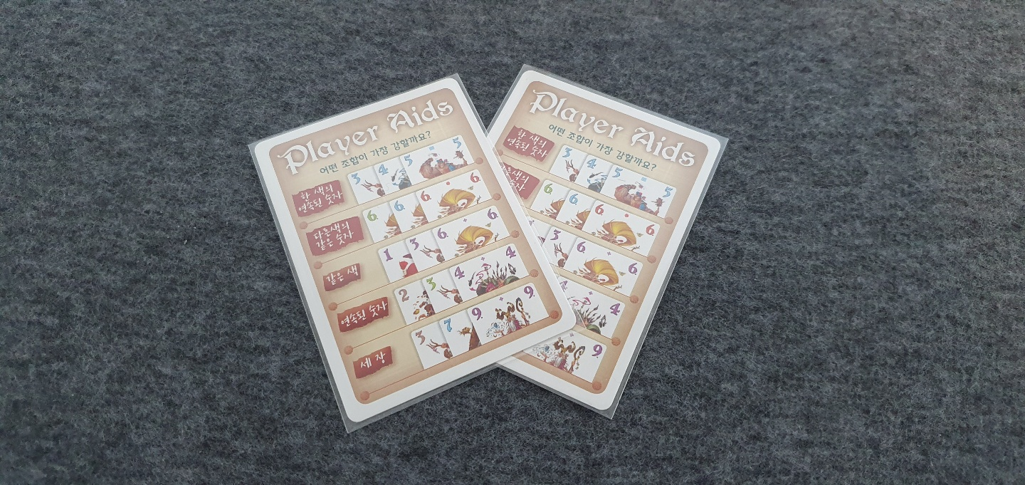 1번이 가장 높은 힘을 가지며 5번이 가장 약한 힘을 가집니다. 조합을 만들기 위해 카드를 내려놓는 순서는 상관없습니다. 조합이 비기는 경우에는 숫자의 합이 더 높은 사람이 승리합니다. 숫자의 합도 동일하다면 3번째 카드를 먼저 내려놓은 사람이 승리합니다. 힘의 세기에서 승리했다면 돌 타일을 자신의 앞으로 가져옵니다.