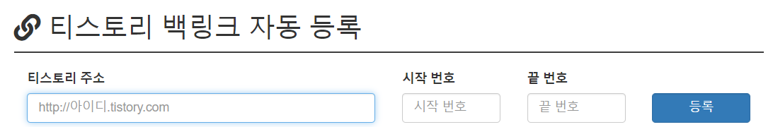 그리고 주소에 자신의 티스토리 주소를 복사 붙여넣기 해주시고, 포스팅의 시작번호와 끝번호를 기재하신 후 등록 버튼을 눌러주세요.