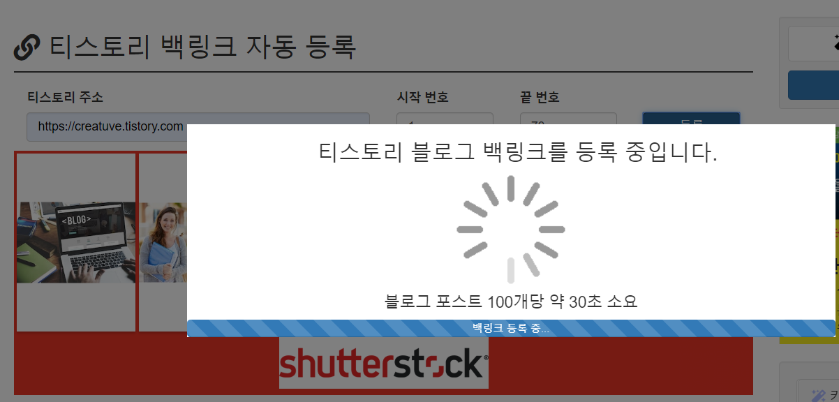 등록버튼을 누르시면 잠깐의 로딩시간과 함께 백링크를 등록한다는 메시지가 나옵니다. 잠시만 기다려주세요.