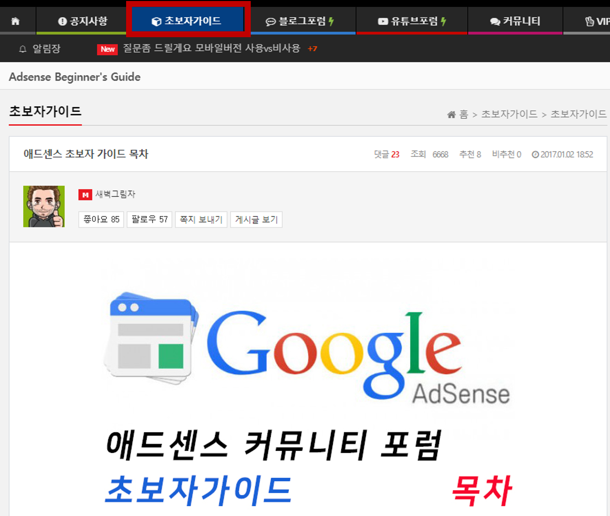 블로그를 공부하던중 우연한 계기로 애드센스포럼을 알게 되었는데요. 초보자 분들을 위한 좋은 팁들이 많이 남겨져 있어요. 특히 저처럼 이제 막 시작하신 분들이라면 상단 메뉴에서 초보자 가이드를 읽어주세요. 개인적으로 이 가이드를 통해서 기초적인 애드센스와 블로그 운영을 이해하는데 매우 큰 도움이 되었습니다.