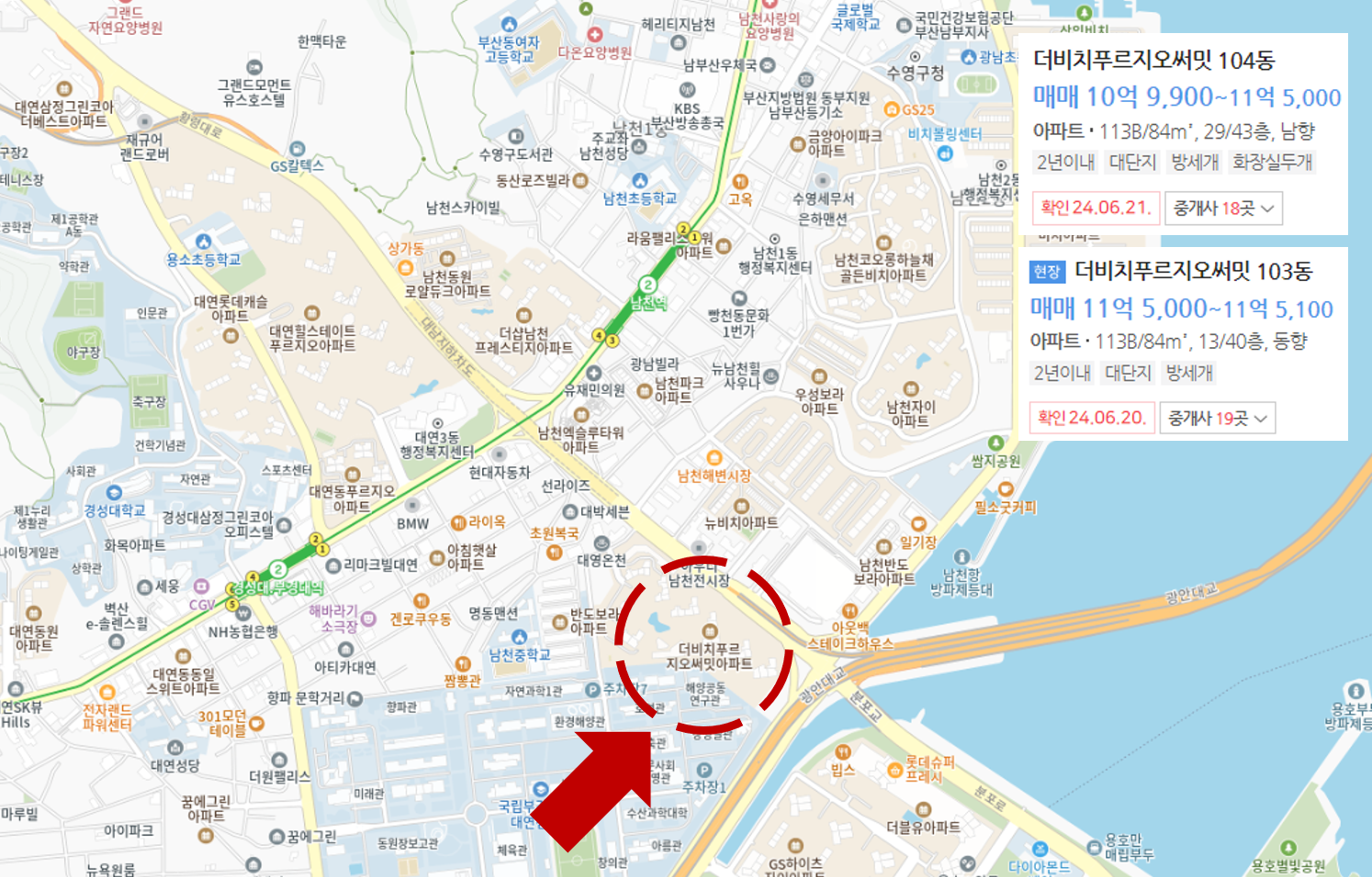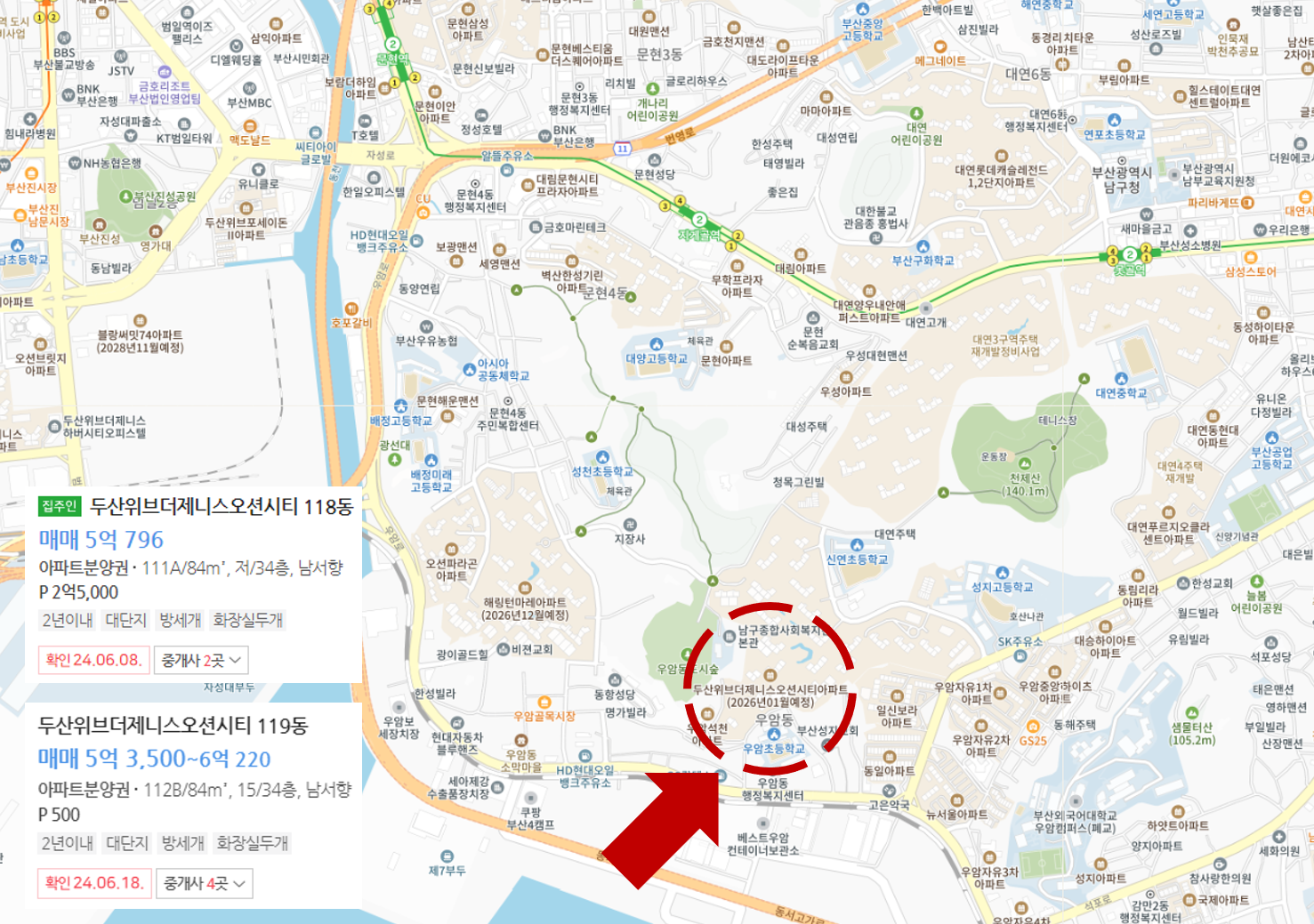 남구 대연동에 위치한 더비치 푸르지오 서밋은 2023년 12월 입주 예정입니다. 이 아파트는 2호선 남천 역과 경성대 부경대역이 가까워 입지가 좋습니다. 현재 마이너스 프리미엄 5천만 원이 적용된 16억 7천만 원에 매물이 나와 있습니다.