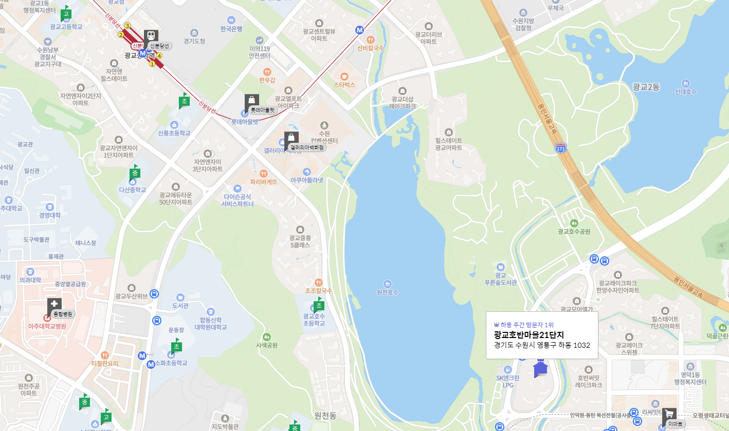 2014년에 준공된 394세대의 대단지로, 방 세 개와 화장실 두 개로 구성되어 있습니다. 광교 테크노밸리와 가까워 일자리와 생활 편의시설이 풍부하며, 신분당선을 이용하면 강남역까지 40분 이내에 도착할 수 있습니다. 과거 최고가는 8억 3,500만 원, 최근 거래가는 6억 6천만 원으로 매물은 6억 천만 원, 전세는 3억 7천만 원에 나와 있습니다.