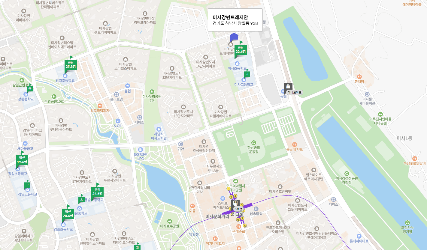 2015년에 준공된 620세대의 대단지로, 방 세 개와 화장실 두 개로 구성되어 있습니다. 5호선 미사역과 한강 호수공원이 가까워 쾌적한 주거 환경을 자랑합니다. 과거 최고가는 8억 원, 최근 거래가는 6억 2천만 원으로 매물은 6억 원, 전세는 3억 5천만 원에 나와 있습니다.