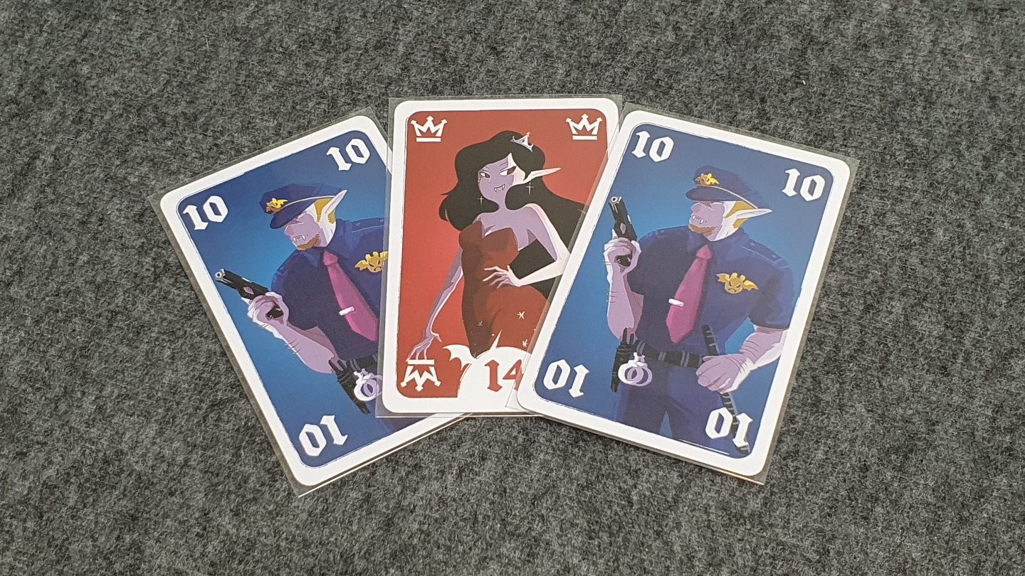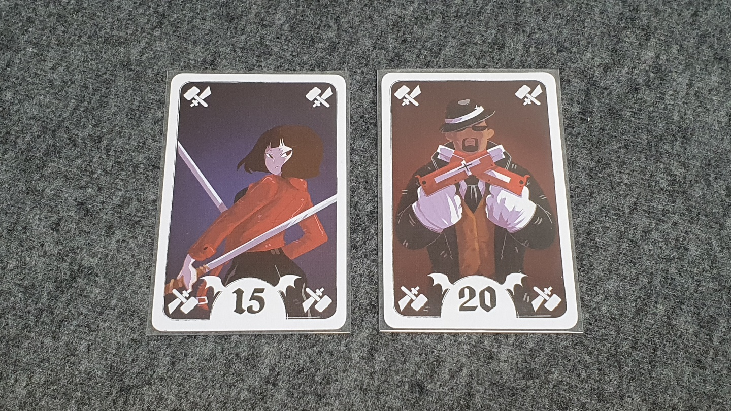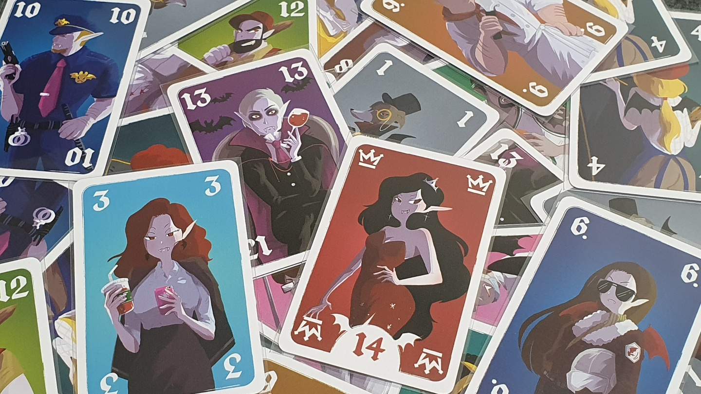 1부터 13까지 각 8장씩있고 가장 강한 카드에 해당하는 14번 뱀파이어 카드는 4장이 있습니다. 사냥꾼 카드에 해당하는 15번과 20번 카드는 각 1장씩 있습니다. 사냥꾼 카드는 앞뒷면이 똑같기 때문에 게임을 진행하는 동안 어떤 플레이어가 들고 있는지 확인할 수 있습니다.