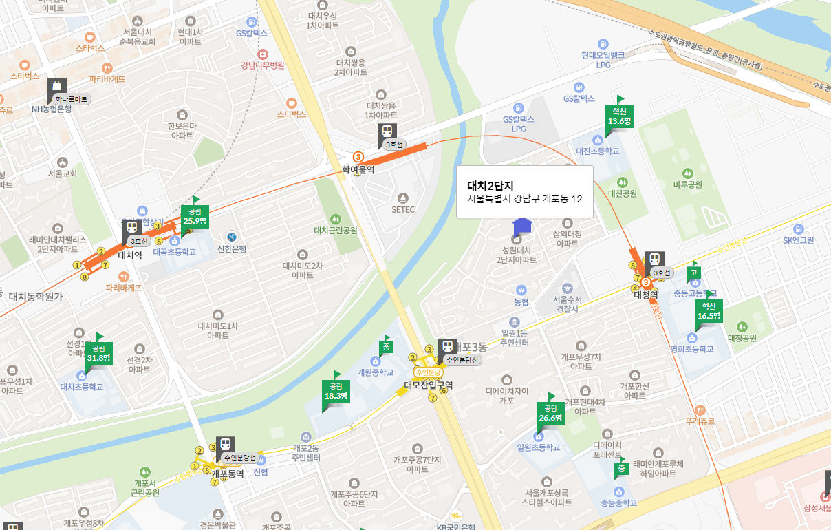 서울시 강남구 개포동에 위치한 '성원대치 2단지' 아파트는 1992년에 사용승인을 받은 1,758세대 규모의 단지입니다. 대청역에서 372m 거리에 위치해 있으며, 최고가는 17억 원에서 2024년 6월에 14억 원으로 3억 원 하락했습니다. 하락률은 18%이며, 최근 전세 가격은 4억 5천만 원으로 매매가 대비 36% 수준입니다.