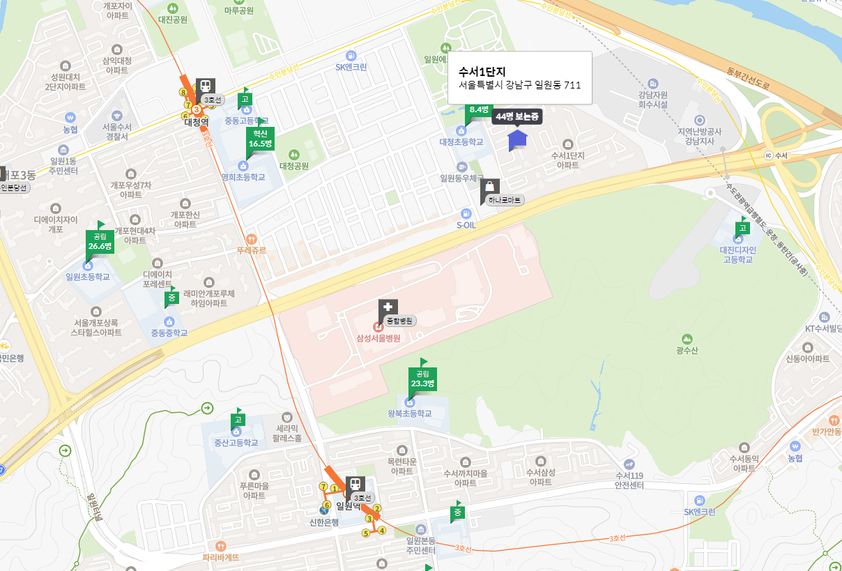 서울시 강남구 일원동에 위치한 '수서 1단지' 아파트는 1992년에 사용승인을 받은 720세대 규모의 단지입니다. 대청역에서 994m 거리에 위치해 있으며, 최고가는 14억 원에서 2024년 6월에 10억 850만 원으로 3억 1천 500만 원 하락했습니다. 하락률은 23%이며, 최근 전세 가격은 4억 4천만 원으로 매매가 대비 41% 수준입니다.