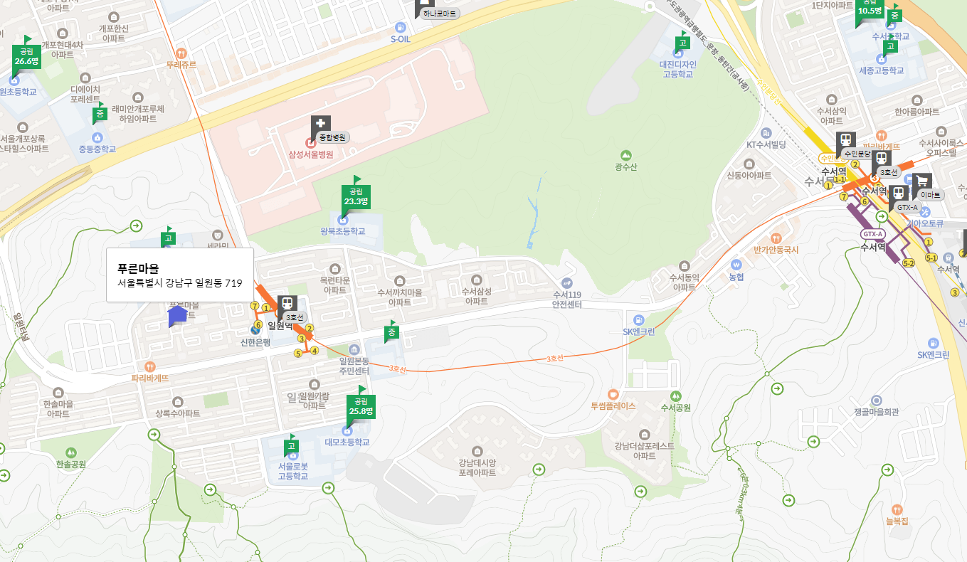 서울시 강남구 일원동에 위치한 '푸른마을' 아파트는 1994년에 사용승인을 받은 930세대 규모의 단지입니다. 이 아파트는 일원역에서 248m 거리에 위치해 있으며, 최고가는 7억 원에서 2024년 6월에 15억 4천만 원으로 1억 6천만 원 하락했습니다. 하락률은 99%이며, 최근 전세 가격은 5억 3,400만 원으로 매매가 대비 44% 수준입니다.