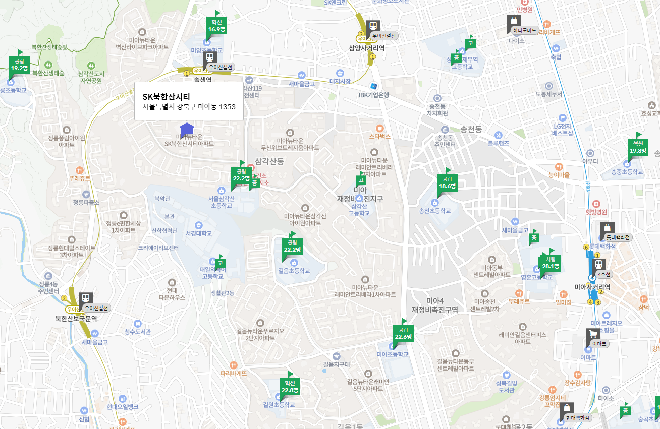 SK 북한산 시티는 강북구 미아동에 위치한 3,830세대 대단지 아파트로, 2021년 10월 최고가 7억 8천만 원에 거래되었으나, 2022년 12월 5억 6천만 원으로 28% 하락했습니다. 우이신설선 솔샘역 도보 이용이 가능하며, 이양초와 삼각산초가 인근에 위치해 있습니다.