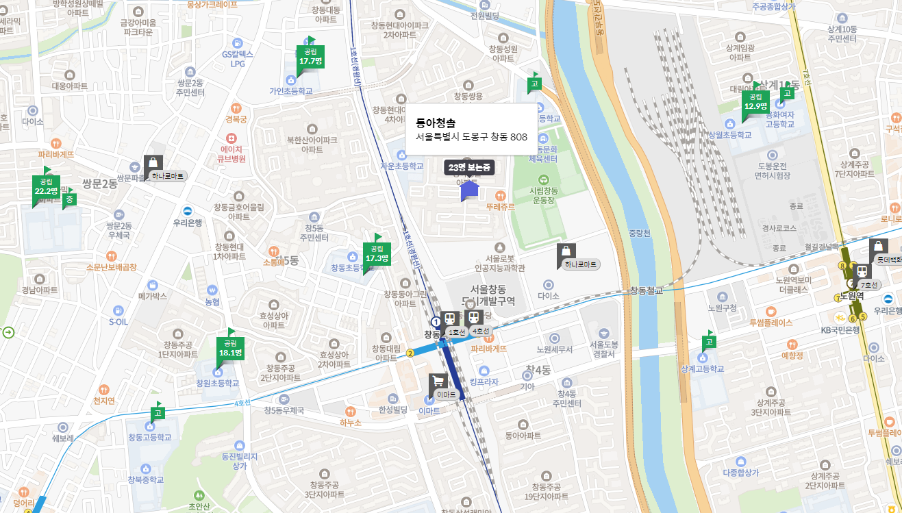 동아 청솔은 도봉구 창동에 위치한 1,981세대 대단지 아파트로, 2021년 7월 최고가 8억 8,800만 원에 거래되었으나, 최근에는 5억 9천만 원으로 33% 하락했습니다. 1호선, 4호선 창동역 도보 이용이 가능하며, 자운초와 자운고가 인근에 있습니다. 창동에는 GTX-C 노선과 다양한 개발 호재가 있어 미래 가치가 높습니다.