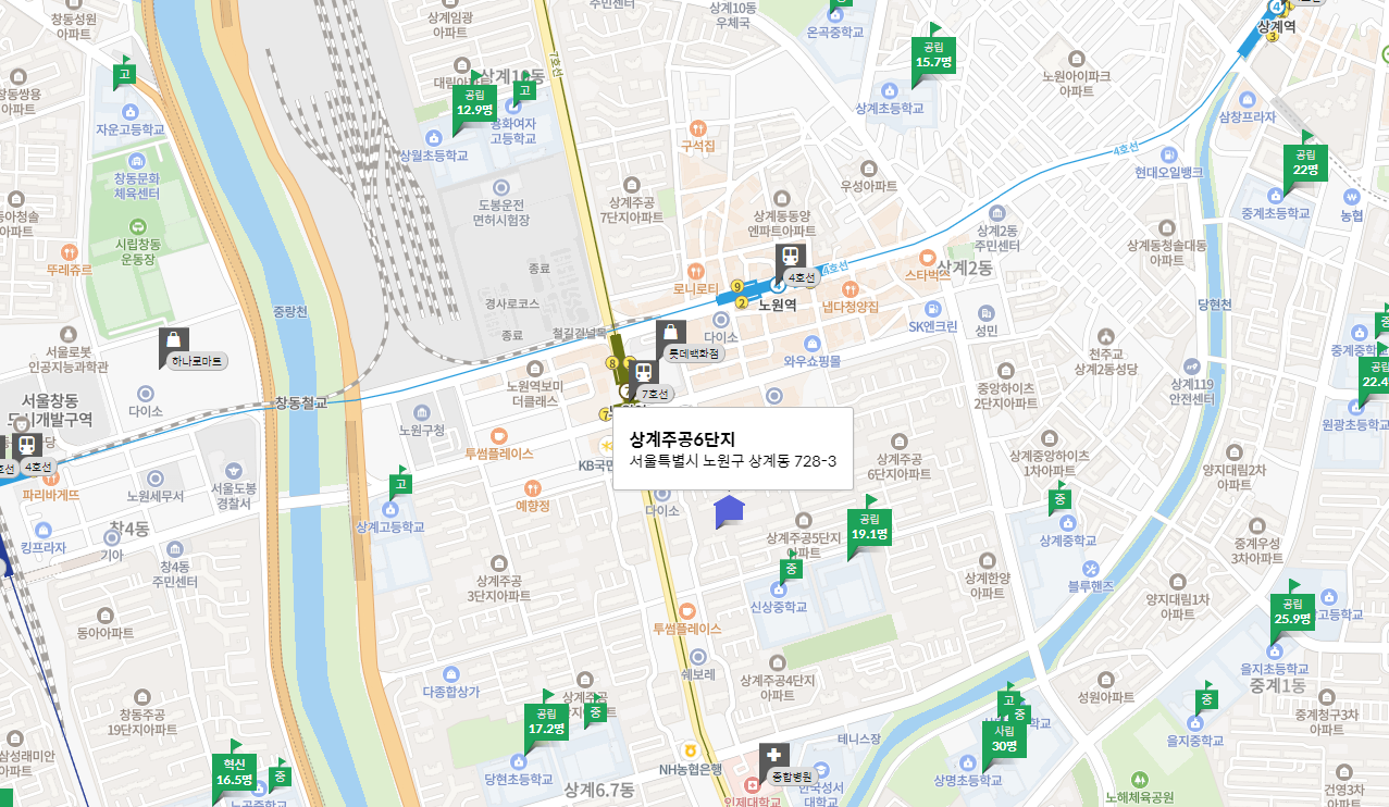 상계주공 6단지는 노원구 상계동에 위치한 2,646세대 대단지 아파트입니다. 2021년 9월 최고가 9억 4천만 원에 거래되었으나, 2022년 11월 5억 8천만 원으로 38% 하락했습니다. 재건축이 확정되었으며, 4호선과 7호선 노원역 도보 이용이 가능합니다. 주변에 신상중, 상계중학교가 위치해 있으며, 노원역 인근의 롯데백화점 등 상권이 발달해 있습니다. 단지는 노후화가 진행 중이나, 재건축을 통해 주거 환경 개선이 기대됩니다.
