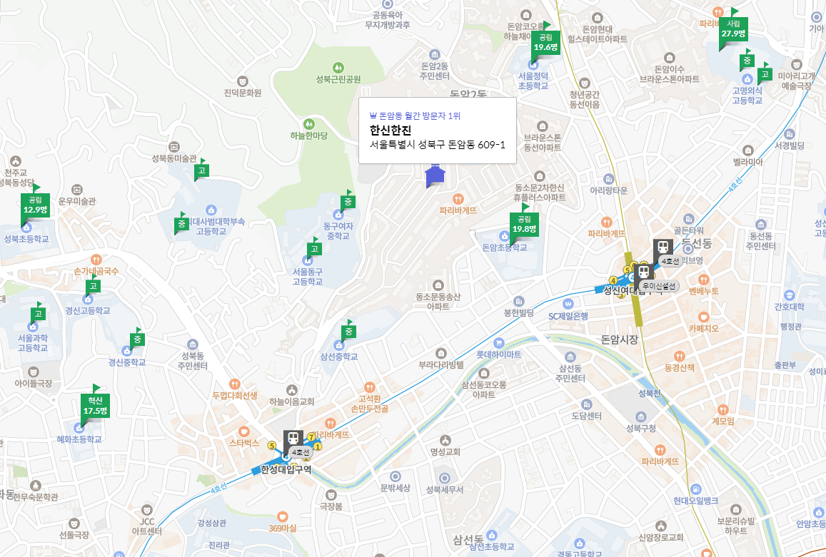 한신한진 아파트는 성북구 돈암동에 위치한 4,515세대 대단지 아파트로, 2021년 10월 최고가 7억 4천만 원에 거래되었으나, 2022년 12월 5억 원으로 32% 하락했습니다. 4호선 성신여대입구역 도보 이용이 가능하며, 우촌초와 도남초가 인근에 위치해 있습니다. 주변에 신통기획 공공 재개발로 인해 정주 환경이 개선될 예정입니다.