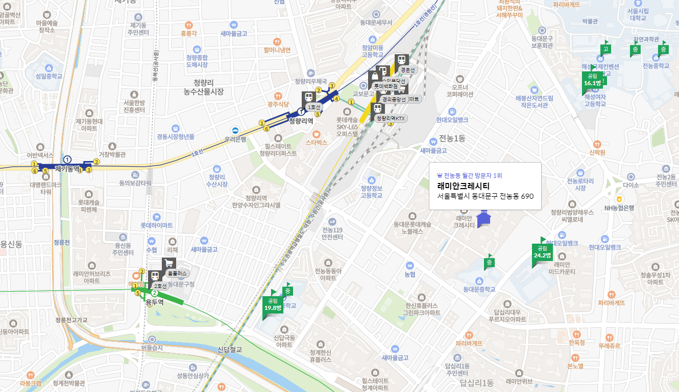 롯데백화점 청량리점과 홈플러스 동대문점 등 생활 편의시설이 가까이 있어 생활이 편리합니다. 향후 교통 호재와 개발로 인해 미래가치가 높을 것으로 기대됩니다. 단지 내 구분과 일부 낙후된 주변 환경이 아쉽지만, 청량리의 대표 아파트로 실거주와 투자 모두에 매력적입니다.