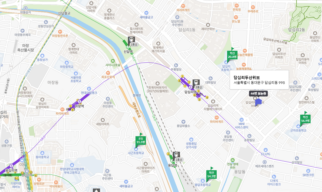 주차 공간은 세대당 1.15대로 넉넉하며, 답십리초등학교와 군자초등학교 중 선택할 수 있습니다. 단지 내에는 경로당, 어린이집, 놀이터, 운동시설 등이 갖춰져 있어 생활 편의성을 높이고 있습니다. 주변 상권은 다소 낙후되어 있지만, 인근에 스타벅스와 투썸플레이스 등 편의시설이 있어 생활에 불편함은 없습니다. 답십리 두산위브는 역세권 아파트로 교통 편리성을 중시하는 사람들에게 적합하며, 주거 환경은 개선이 필요합니다.